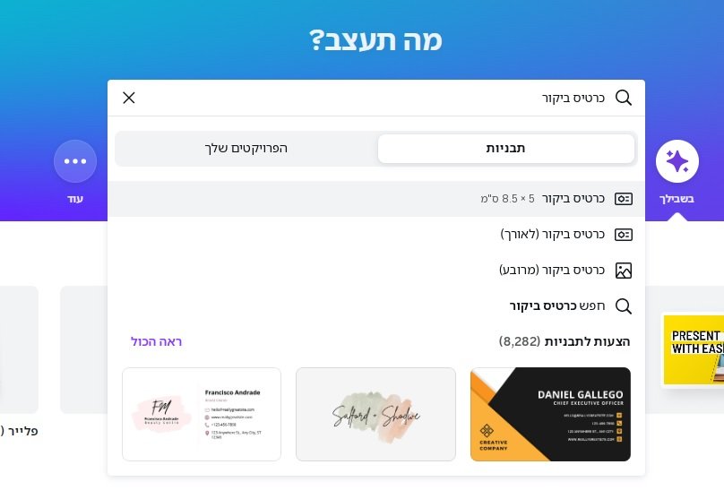 - נבחר "צור עיצוב" ולאחר מכן נגלול ונבחר ב "כרטיס ביקור" .